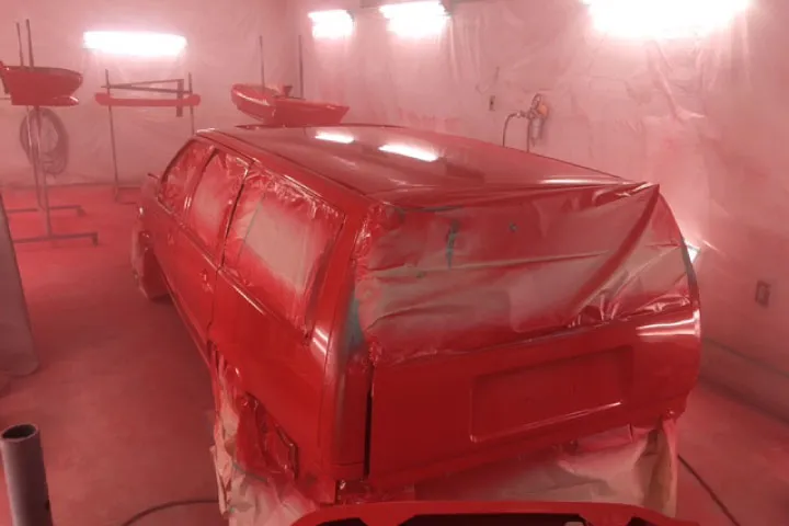 真っ赤なボルボが蘇る板金塗装の様子です。